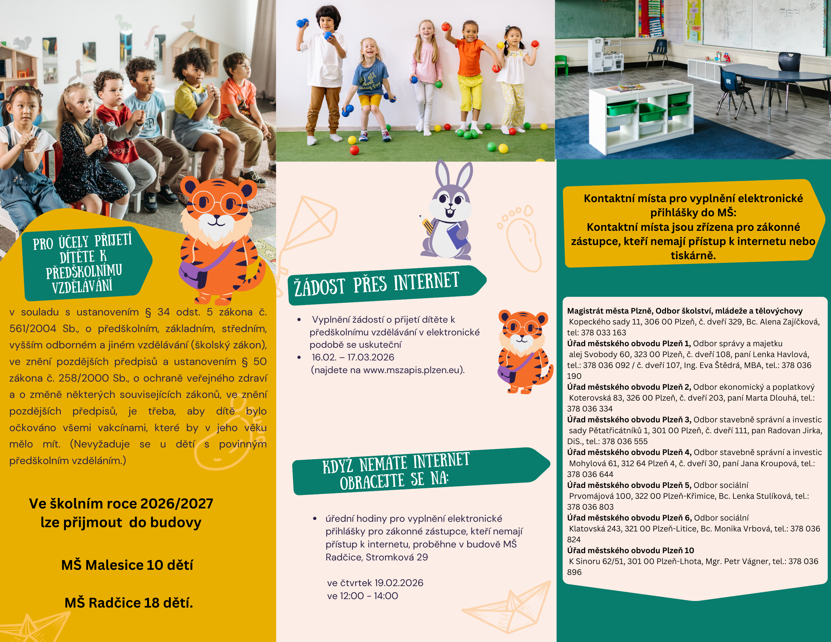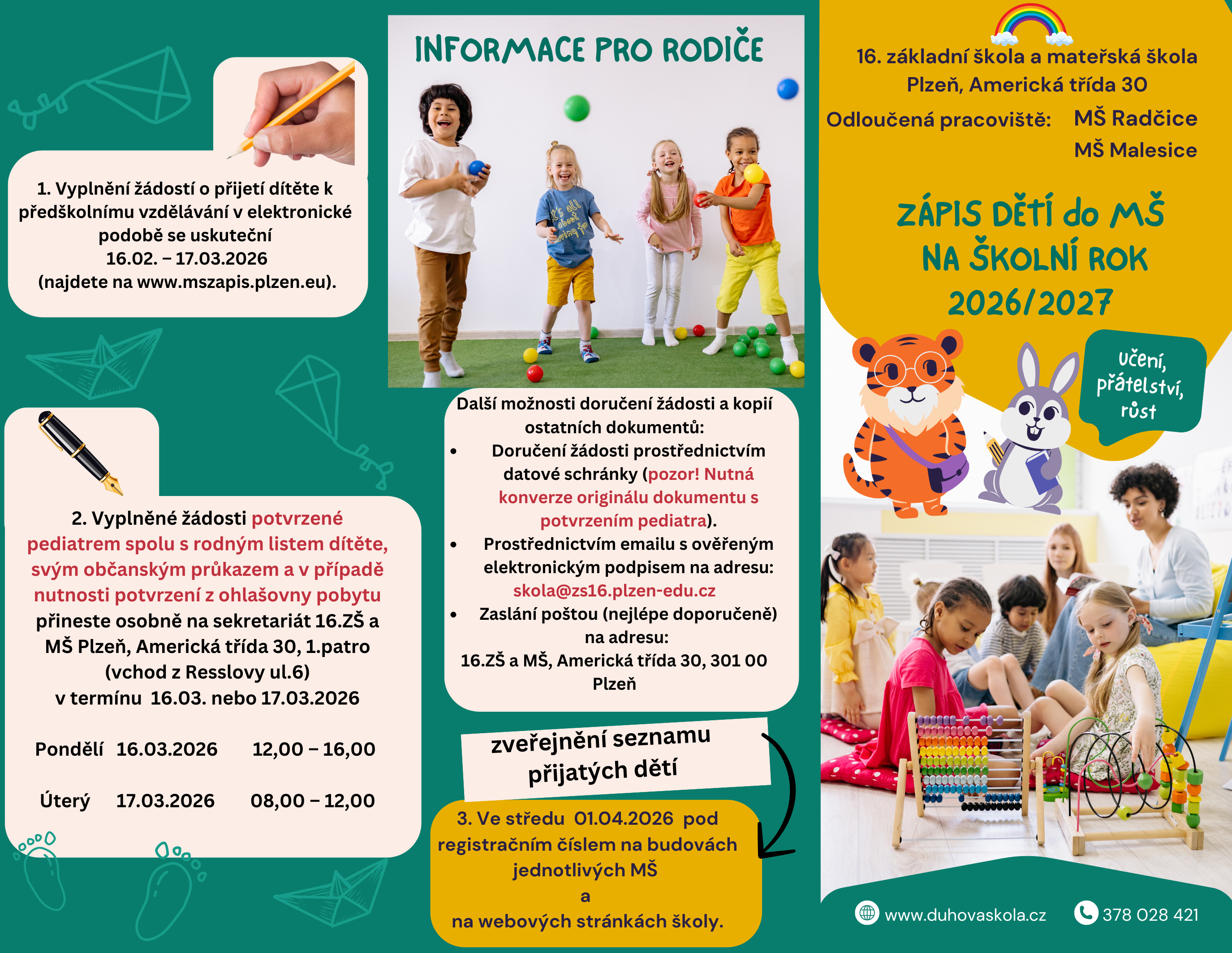 Vydávání žádosti o přijetí dítěte k předškolnímu vzdělávání se uskuteční pouze v elektronické podobě. Podrobnosti k přijímacímu řízení jsou k dispozici níže na Informace pro rodiče.
